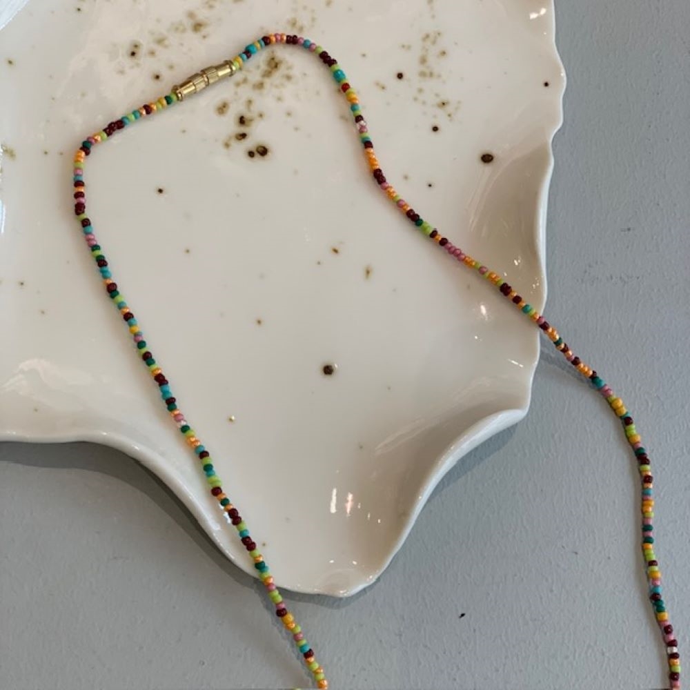 Nila perlehalskæde fra Annavii er en farverig og legende halskæde, der tilfører et personligt touch til dit look. De multifarvede glasperler skaber et levende udtryk, som nemt kan styles både alene eller i kombination med andre smykker.