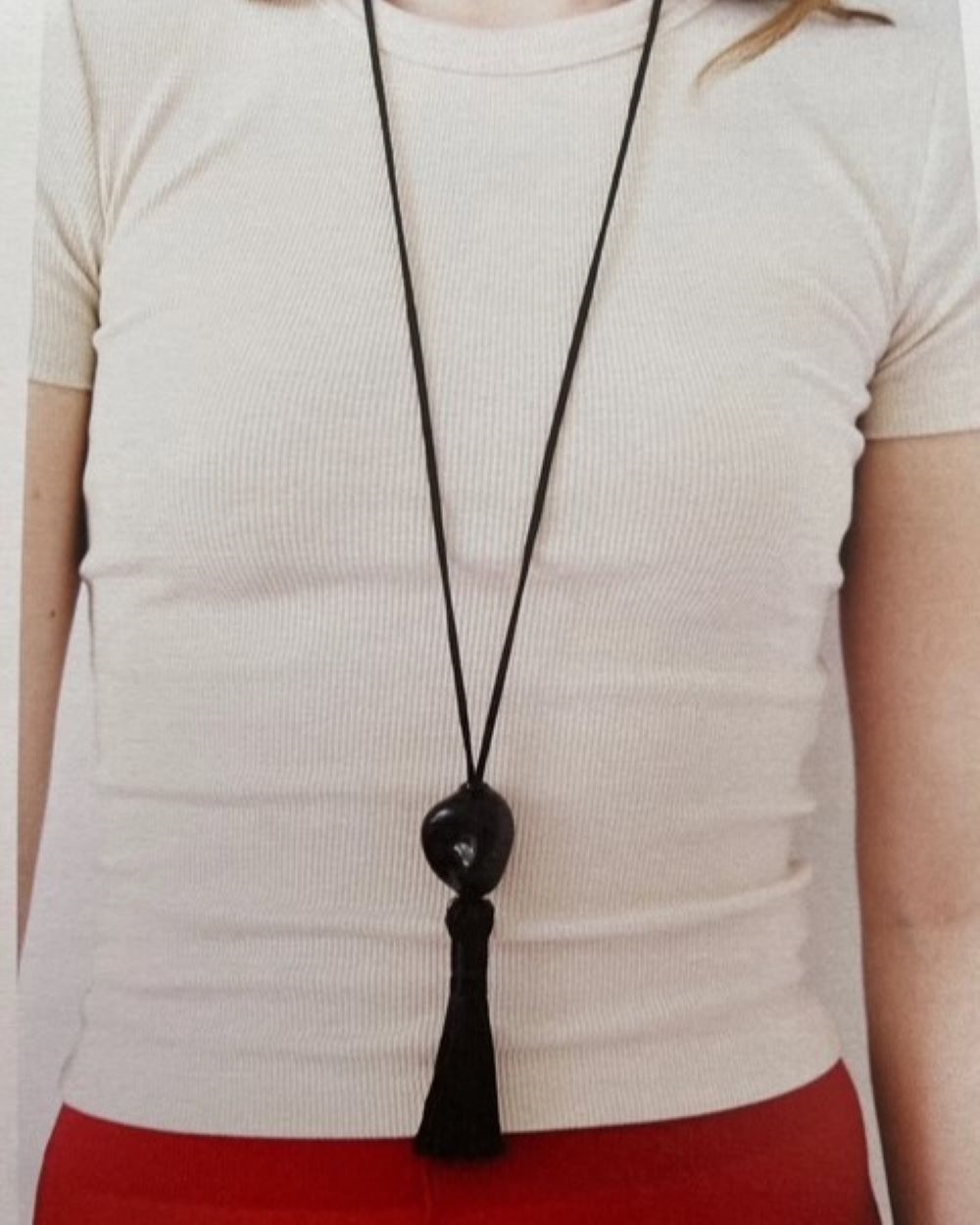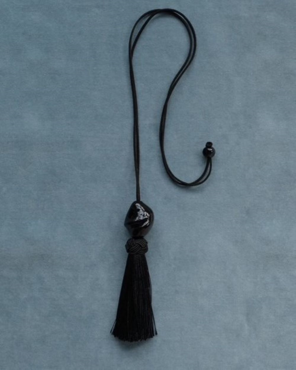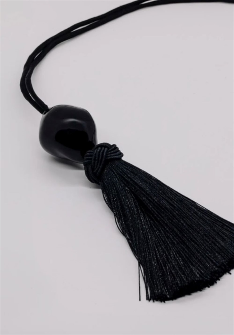 Casati Necklace er en lang halskæde med et kunstnerisk og organisk udtryk. Halskæden er designet med en uregelmæssig sort vedhængsperle i håndblæst glas, som giver hvert smykke sit eget unikke præg. Vedhænget er monteret på en blød suedette-rem og afsluttes med en elegant kvast i ice silk, der tilfører bevægelse og lethed til designet.