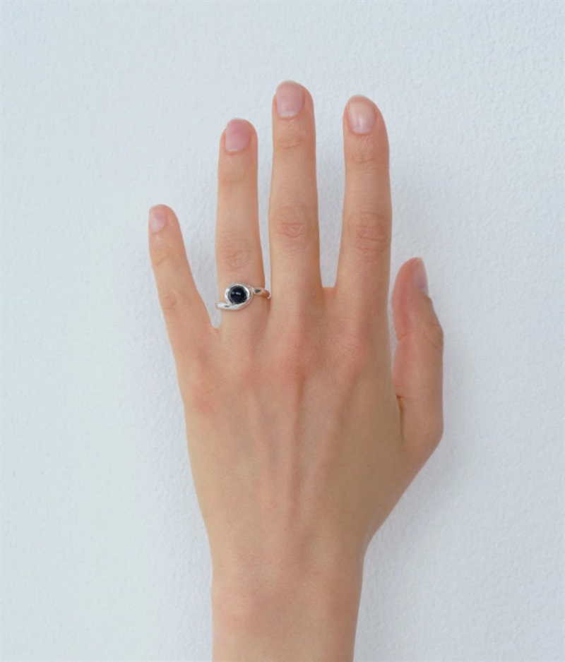 Petite Lago Onyx Ring fra CORALI er en håndlavet ring i 100% genanvendt sterlingsølv, prydet med en rund sort onyx-sten. Den er en mindre version af den klassiske Lago-ring og en del af Cadence-kollektionen.
