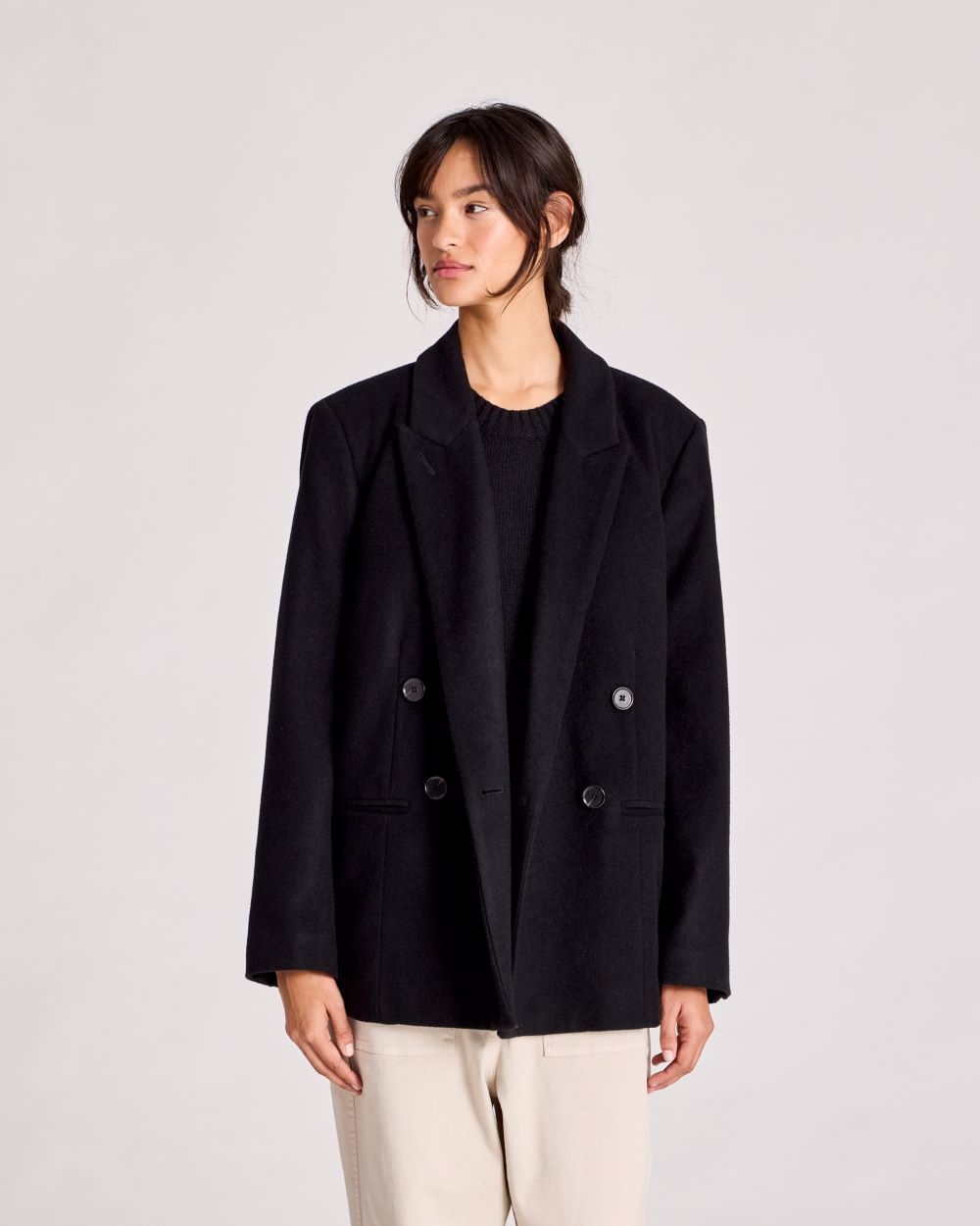 Josephine Jacket fra GAI+LISVA er en tidløs dobbeltradet blazer med et elegant og afslappet udtryk. Blazeren er fremstillet i 100% genanvendt uld, hvilket gør den både bæredygtig og luksuriøs på samme tid. Designet har klassisk krave med revers, to lommer foran og dekorative knapper ved ærmerne. Den lige, oversize pasform giver et moderne og effortless look — perfekt over både kjoler og skjorter.