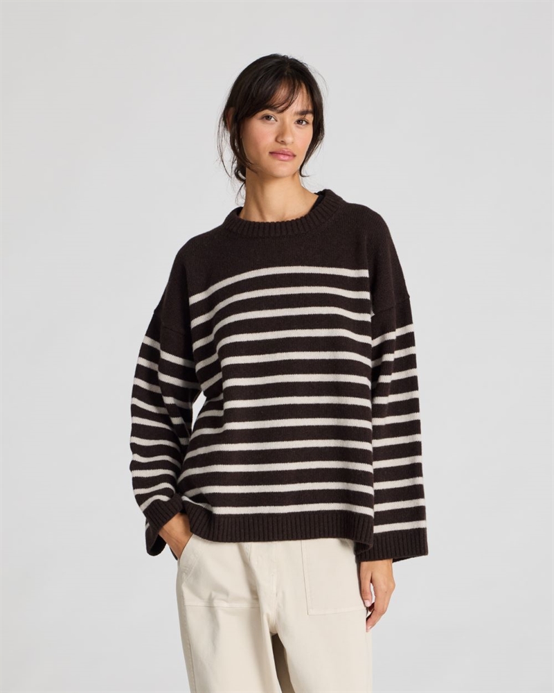 Barbera er en langærmet, stribet strik i 100% lammeuld. Strikken har rund halsudskæring, dropped shoulders og ribkanter ved hals, ærmer og bund. Den er designet i en oversize pasform, som giver et afslappet og komfortabelt udtryk.