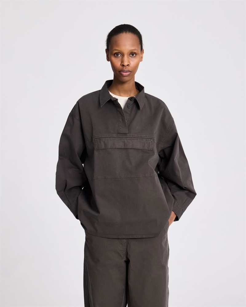 Anorakken har stolpeåbning med hornknapper, en paspoleret lomme foran samt hornknapper ved manchetterne. Den lave skuldersøm giver et afslappet look, og modellen har en let oversized pasform.