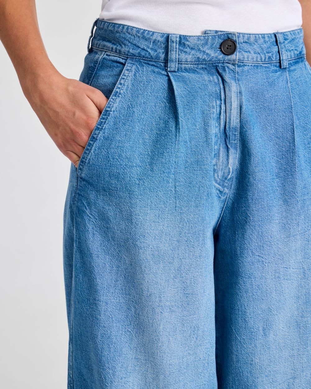 Bukserne har fast linning med hornknaplukning, bæltestropper samt lommer foran og paspolerede lommer bagpå. De fine læg foran giver ekstra bevægelsesfrihed og bidrager til den afslappede silhuet. Bukserne har lige ben.