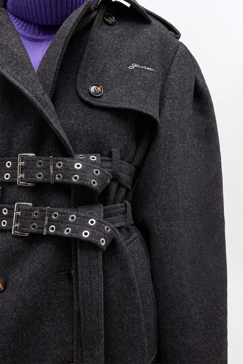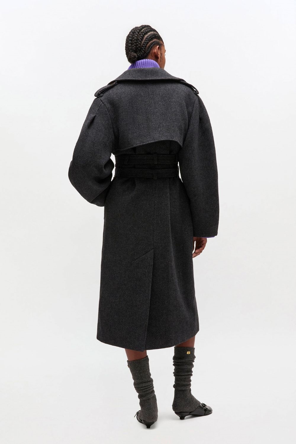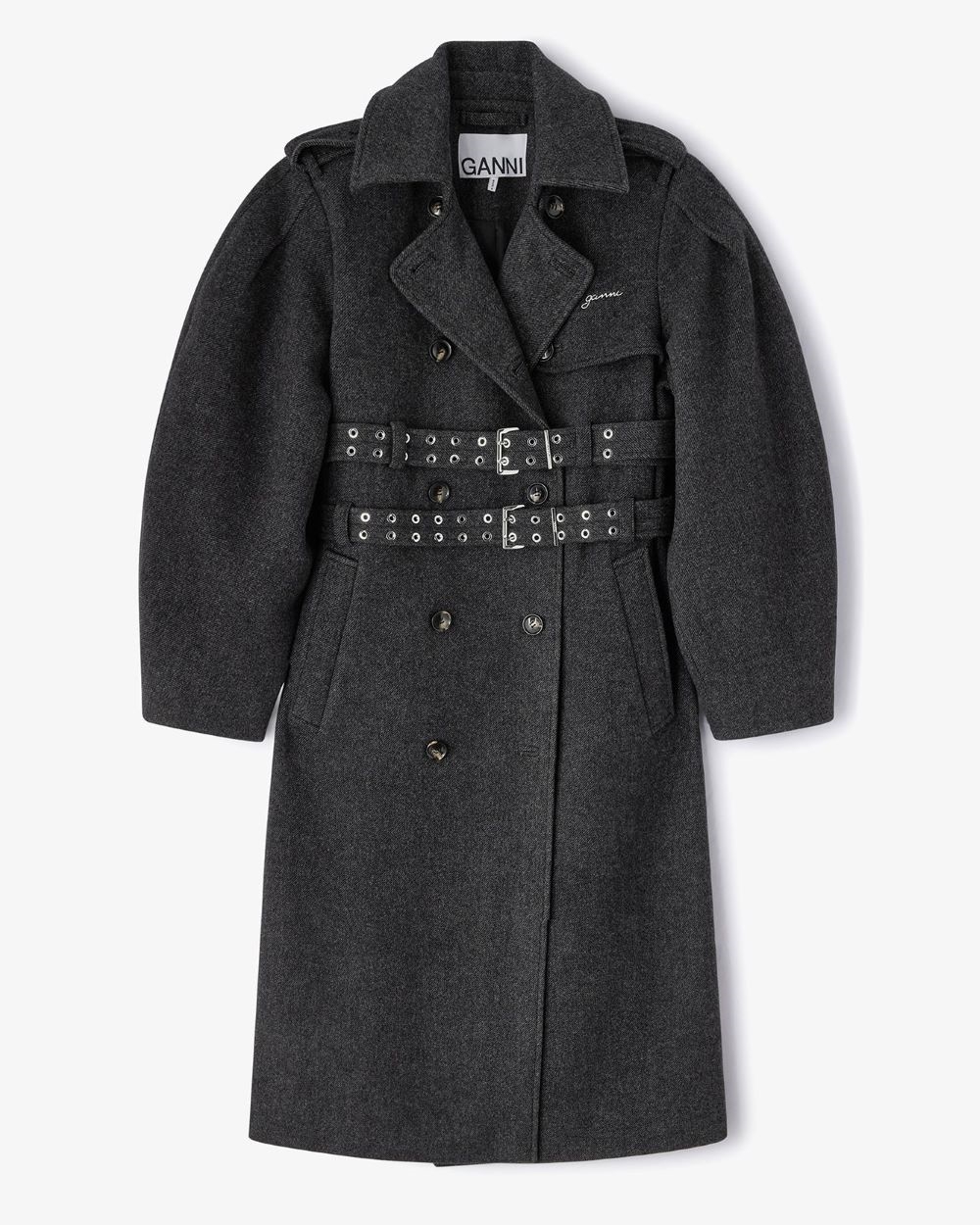 Denne elegante trenchcoat fra GANNI er fremstillet i en eksklusiv uldblanding med et klassisk, men moderne udtryk. Frakken har en dobbeltradet lukning og markante, justerbare bælter, der giver mulighed for at forme silhuetten. De rundede ærmer og rene linjer tilfører et sofistikeret look, mens diskrete logo-detaljer understreger GANNIs karakteristiske design-DNA.