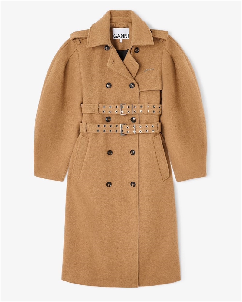 Denne elegante trenchcoat fra GANNI er fremstillet i en eksklusiv uldblanding med et klassisk, men moderne udtryk. Frakken har en dobbeltradet lukning og markante, justerbare bælter, der giver mulighed for at forme silhuetten. De rundede ærmer og rene linjer tilfører et sofistikeret look, mens diskrete logo-detaljer understreger GANNIs karakteristiske design-DNA.