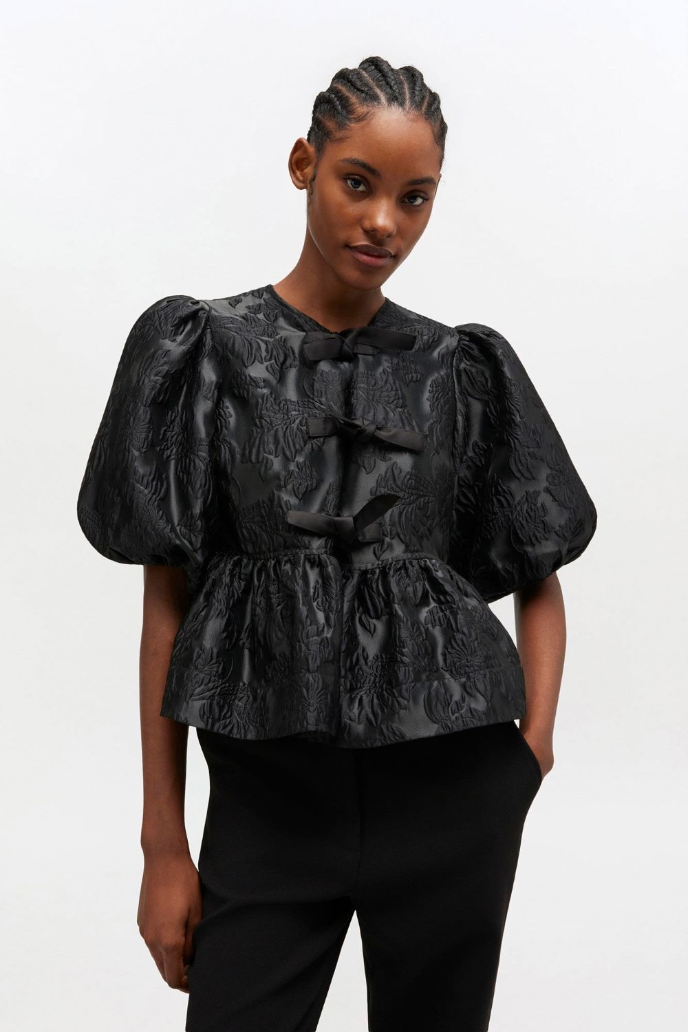 GANNI A1040079 SATIN PEPLUM TIE BLOUSE BLACK