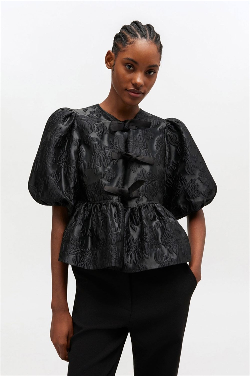 En feminin og elegant satinbluse fra GANNI, designet med en smuk, rund halsudskæring og fine bindebånd foran. Blusen har pufærmer med elastiske kanter, som giver et let og sofistikeret udtryk, og den markante peplumkant skaber en flatterende silhuet.
