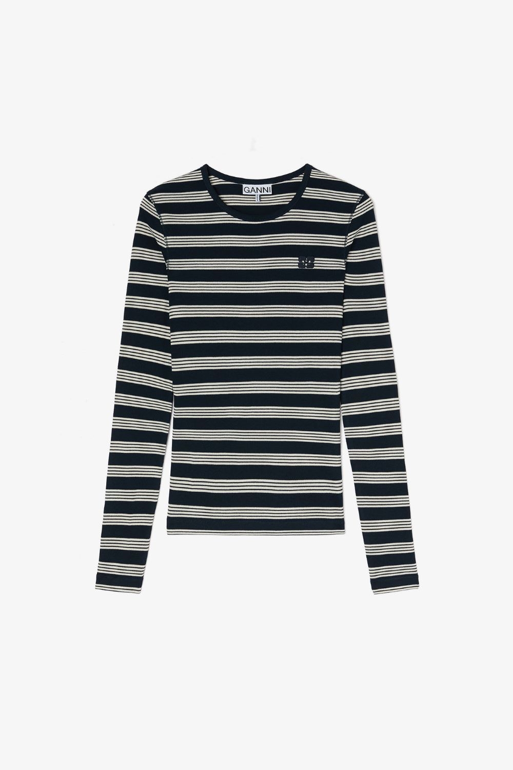 En blød og komfortabel langærmet ribstrik fra GANNI i farven sky captain med fine kontraststriber. Trøjen har en klassisk rund halsudskæring, tætsiddende pasform og et diskret GANNI-logo foran, der fuldender det sporty, hverdagsvenlige udtryk. Den strækbare ribkvalitet gør den både behagelig og flatterende.