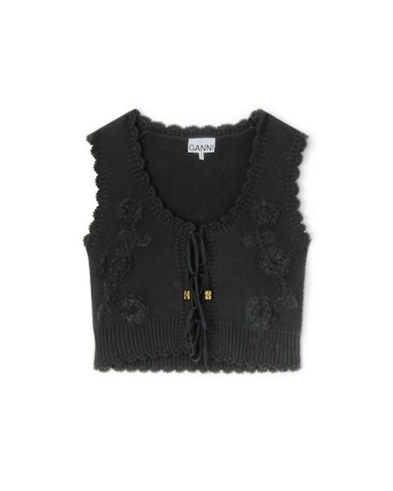 Strikvest fra GANNI i en blød bomulds- og cashmereblanding. Vesten har bindebånd i siderne, som giver mulighed for justering og styling, samt et diskret GANNI-logo i snørren. Et alsidigt lag-på-lag piece, der kan styles over skjorter, kjoler eller alene for et moderne udtryk.