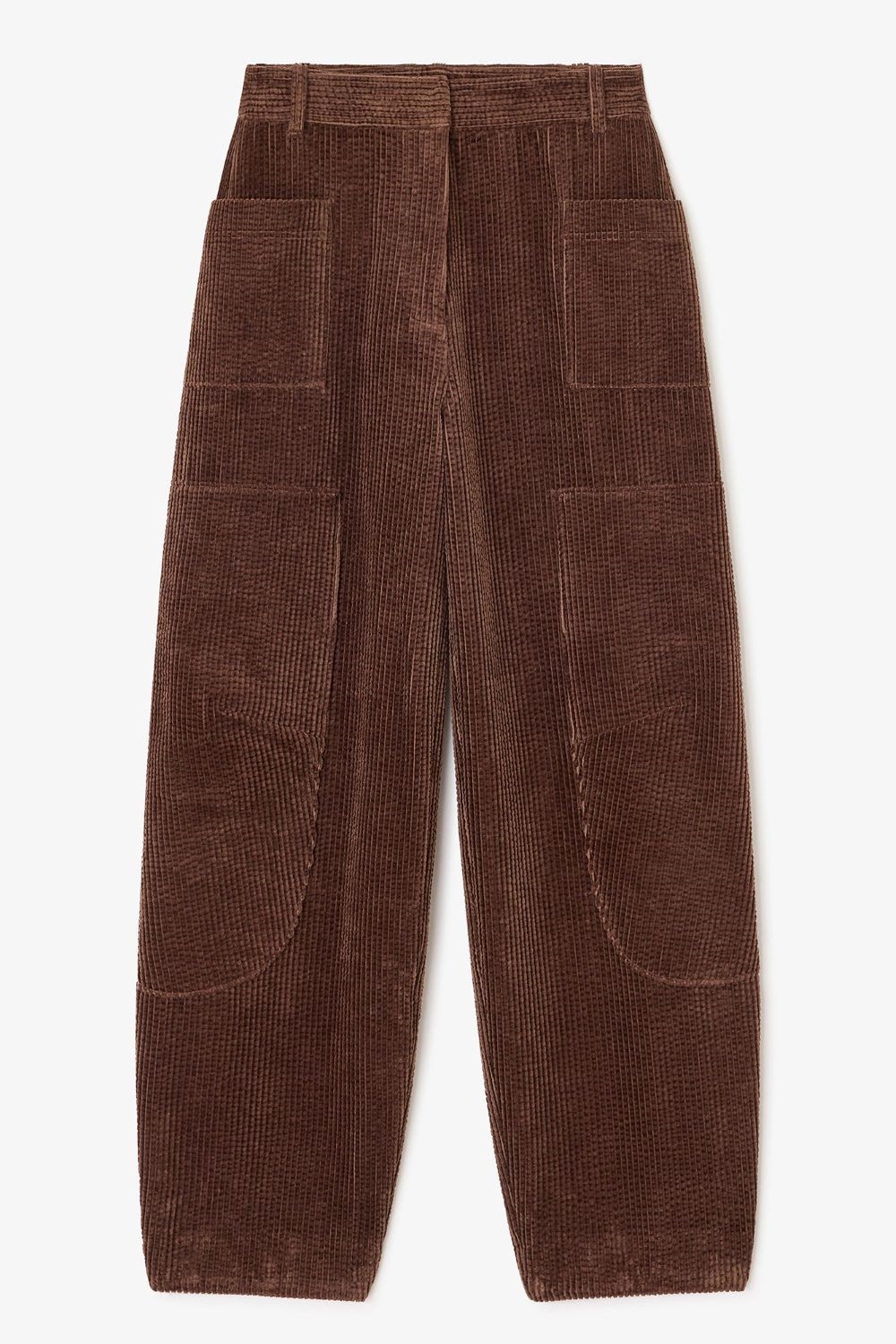 Disse buede bukser fra GANNI er fremstillet i blødt fløjl af 99% økologisk bomuld og 1% elastan, hvilket giver både komfort og let stræk. Designet har hægtelukning, bæltestropper og tre praktiske lommer. Den brune nuance Chicory Coffee giver bukserne et tidløst look, der nemt kan styles til både hverdag og mere formelle lejligheder.