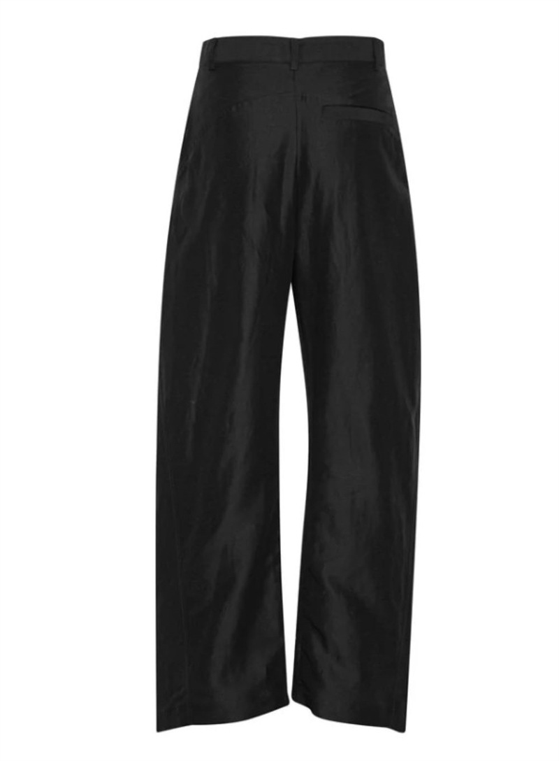 Bukserne er fremstillet i en let og flydende Tencel- og hørblanding, som giver en smuk bevægelse og høj komfort. Den brede benvidde og det diskrete high-low design tilfører silhuetten et unikt og dynamisk udtryk.
