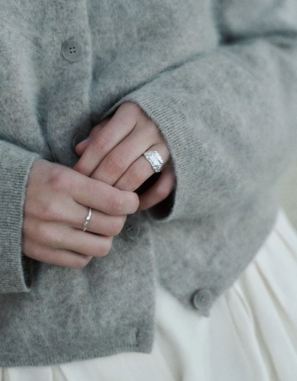 Bine Ring fra Lea Hoyer er en elegant og enkel ring skabt i sterlingsølv. Den er designet med en organisk, ujævn overflade, fremstillet ved hjælp af den unikke water-cast teknik, der giver hver ring sit eget udtryk. Den fine, tynde form gør den ideel som pinkyring eller som en del af et smykkelook med flere ringe.