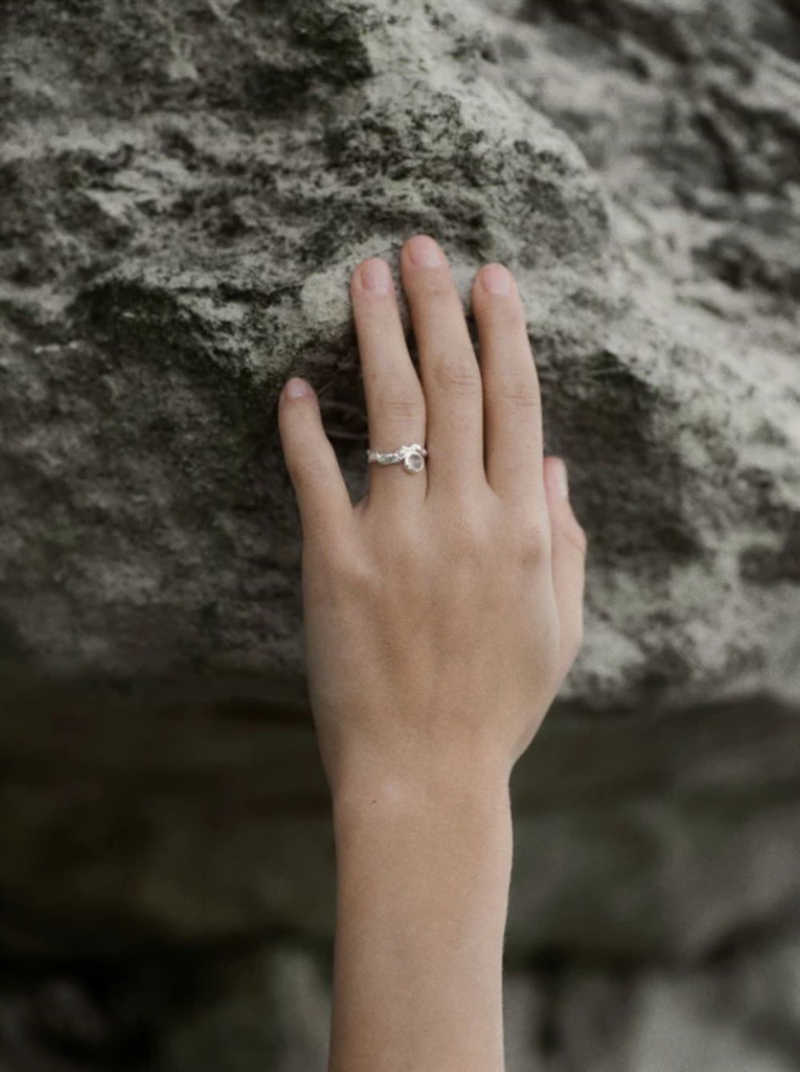 Blanca ringen fra Lea Hoyer er livlig og organisk med en dynamisk form. Den har en unik uregelmæssig loop foran, hvor en smuk 5 mm grå agat er placeret som centrum. Den grå agat symboliserer ro, balance og jordforbindelse. Hver Blanca ring er unik, både i sin form og i agatens naturlige farvevariation.