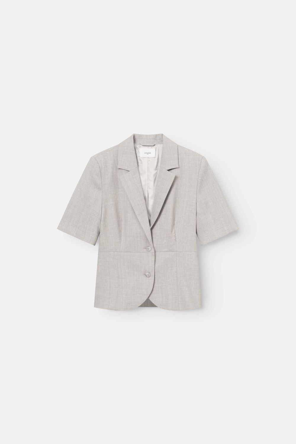 Alana Blazer er en elegant, tætsiddende blazer i en lys grå melange, der kombinerer klassisk tailoring med moderne detaljer. Den stilrene silhuet gør den ideel til både arbejde og aftenbrug, mens de korte ærmer tilfører et nutidigt twist.