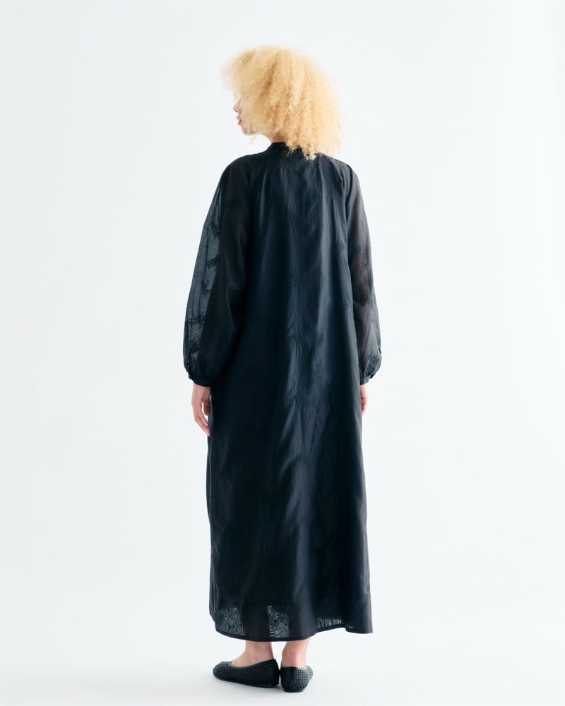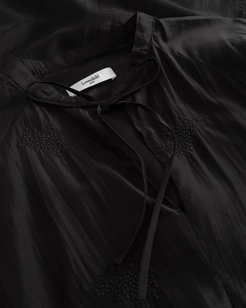 Anja Dress fra Lovechild 1979 er en sort kjole, der forener elegance og komfort i et tidløst design. Kjolen har lange, voluminøse raglanærmer med manchetknapper bagpå, som tilfører et sofistikeret og karakterfuldt udtryk.