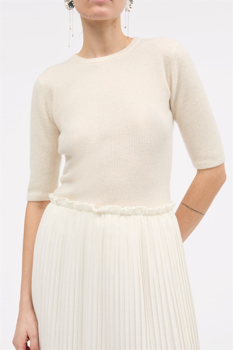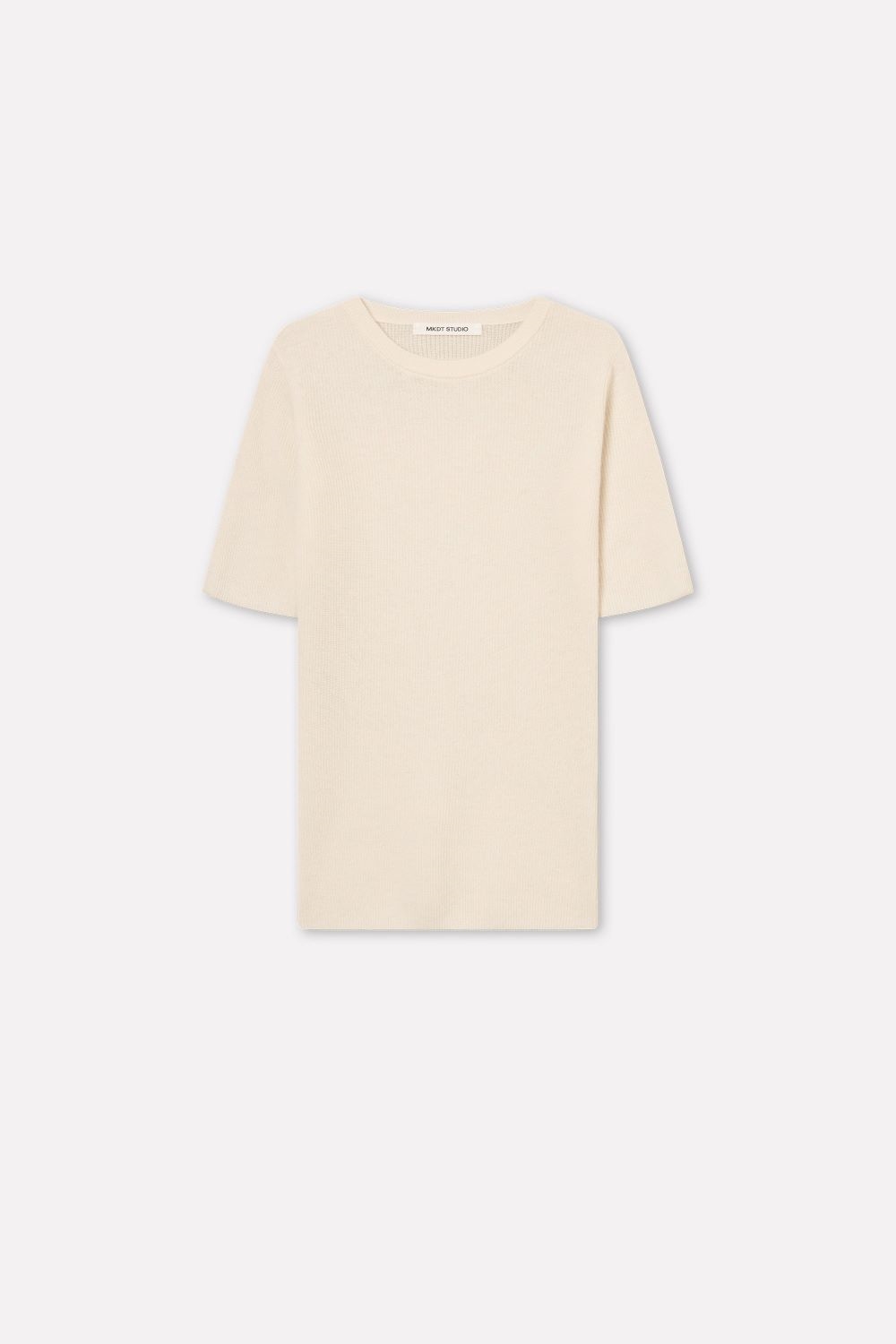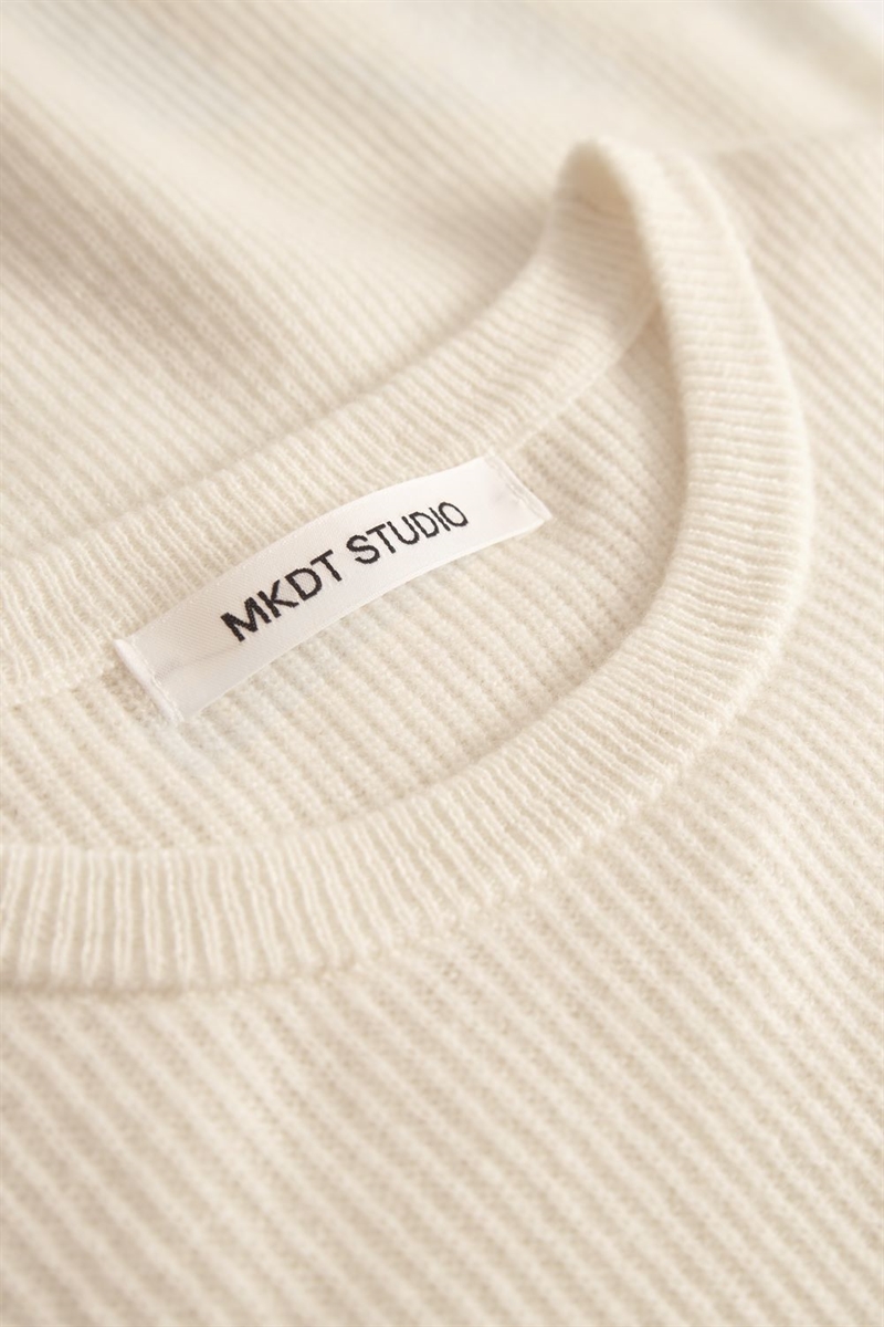 Oplev minimalistisk luksus med MKDT Kami Cashmere – en strikket T-shirt i 100% kashmir, designet med rund halsudskæring og korte ærmer. Den elegante ivory-tone giver et raffineret og tidløst udtryk, som passer perfekt ind i enhver garderobe.