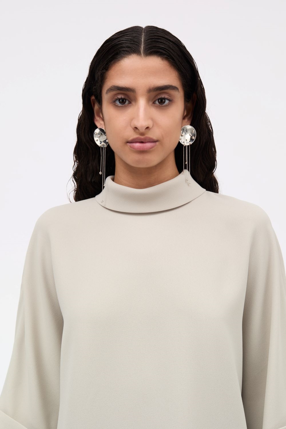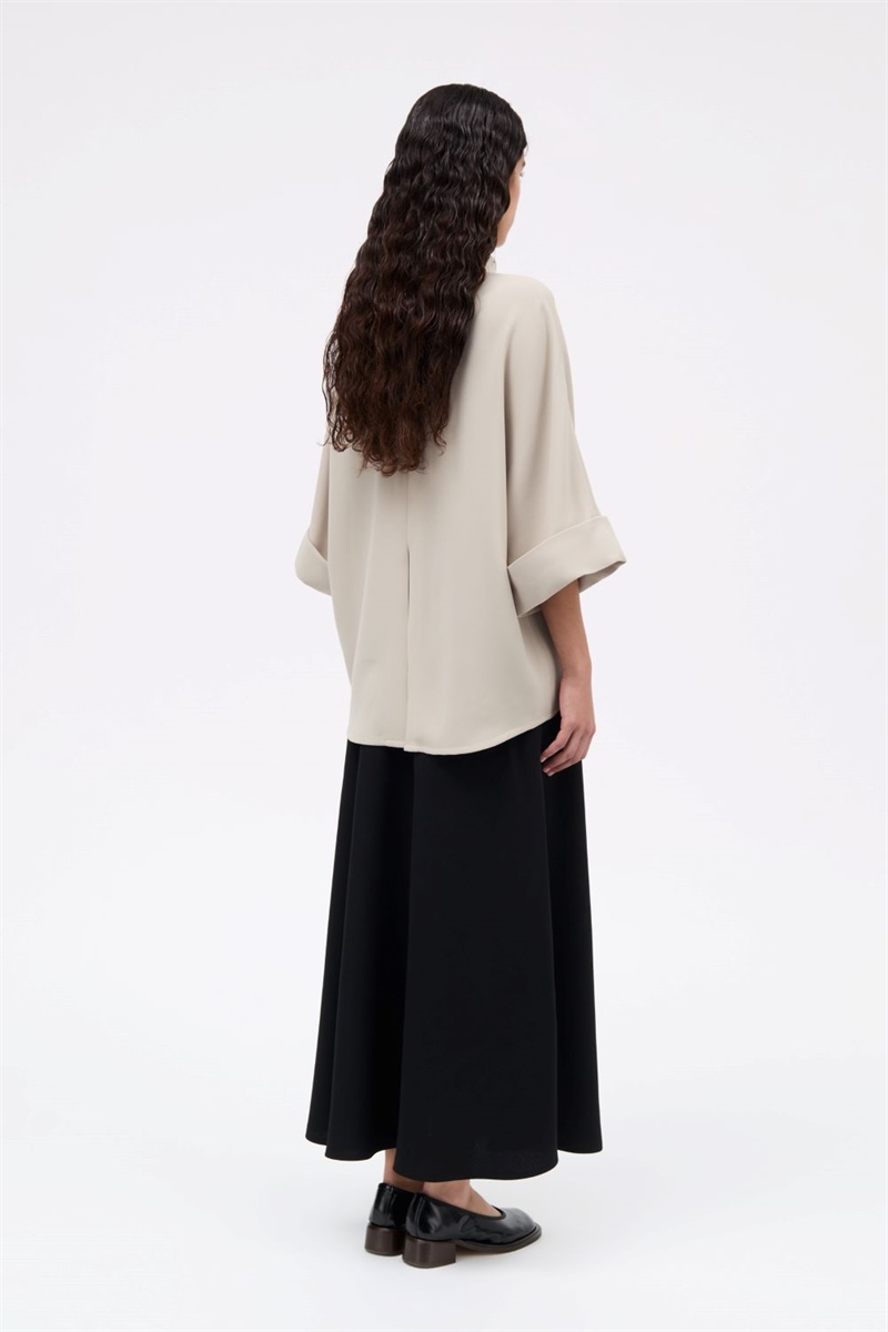 Stilren bluse fra MKDT. Designet med foldet krave og batwing-ærmer med opadvendte manchetter – perfekt til både hverdag og fest. Match med bukser i samme materiale for et komplet look.