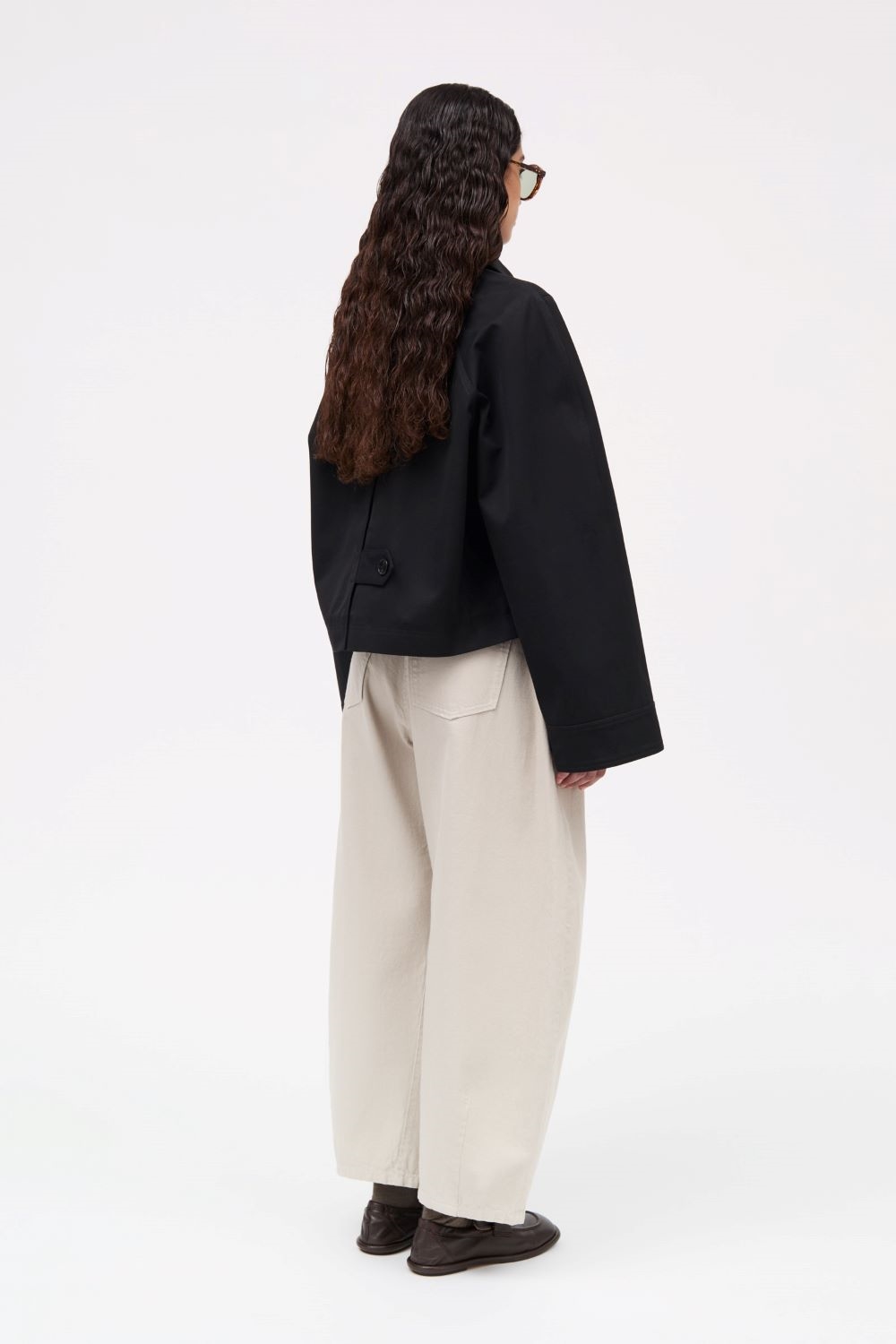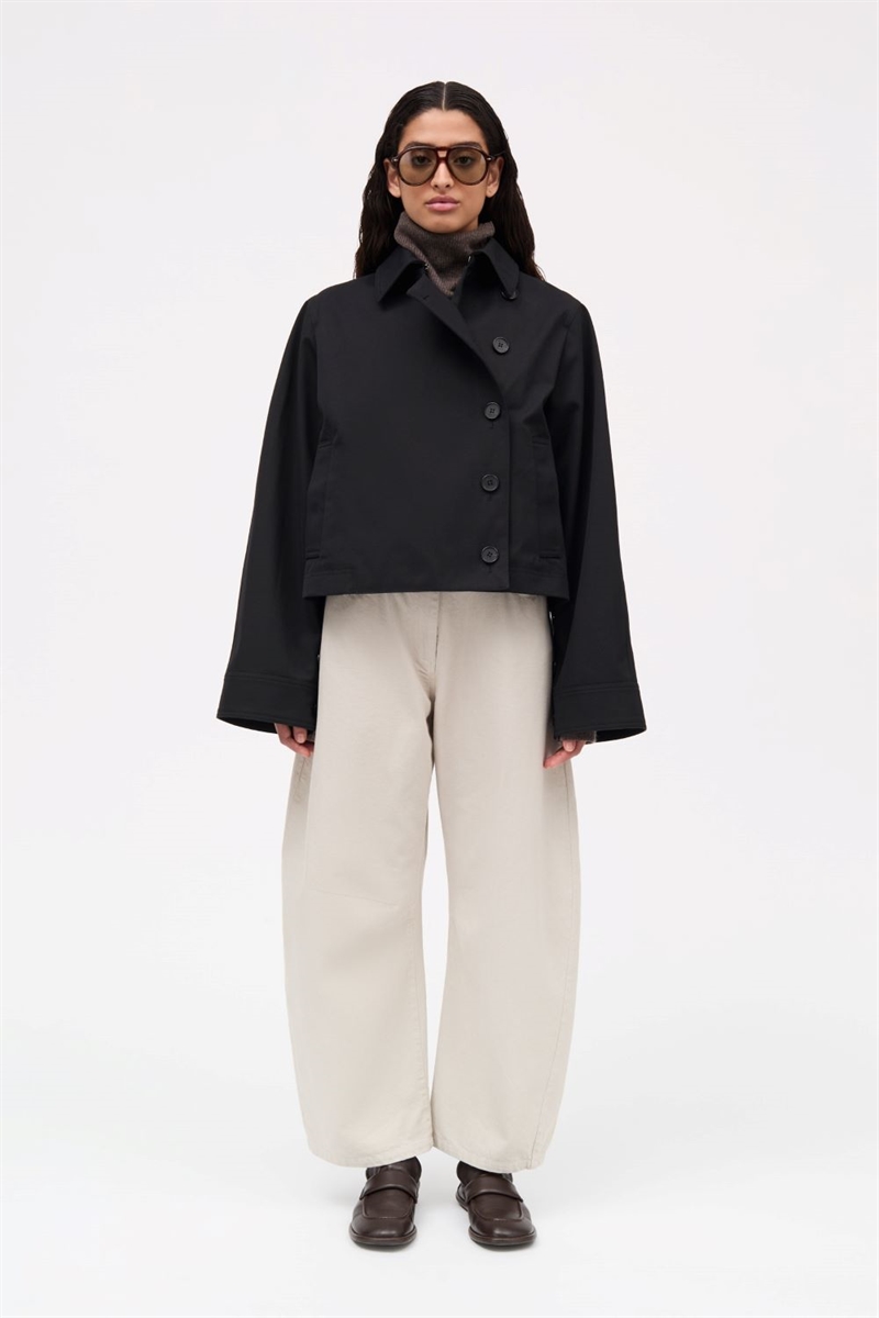 Calypso Jacket er en kort, boxy jakke i bonded cotton med et arkitektonisk snit. Den løse pasform og forkortede længde giver jakken et moderne og markant udtryk, der fungerer perfekt som overgangsjakke.