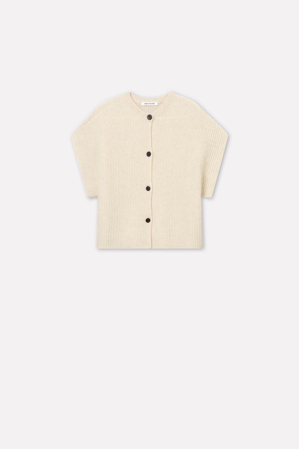 En luksuriøs og moderne tilføjelse til garderoben – MKDT Thilda Yak er en cropped cardigan med korte flagermusærmer og elegante sorte knapper. Den er strikket i 100% yak-uld, kendt for sin enestående blødhed, varme og lette kvalitet. Pasformen er løs og afslappet, hvilket giver et cool og ubesværet look.