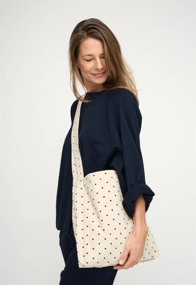 Crossover-taske i slidstærk kanvaskvalitet med Moshi Moshi Minds ikoniske signaturprikker. Tasken har en bred, komfortabel rem, der gør den ideel til både hverdag og rejser. Den rummelige form giver plads til alle dine nødvendigheder, mens det tidløse design passer perfekt til både afslappede og stilfulde outfits.