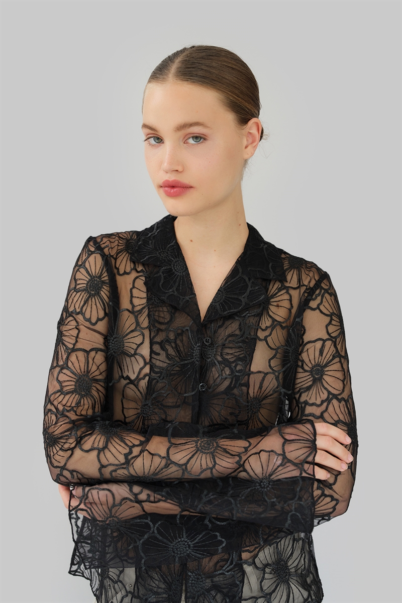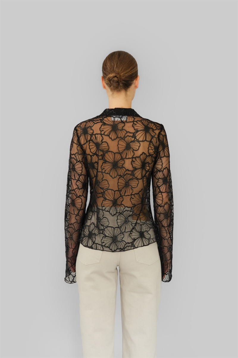 Flora Shirt fra Operasport er en elegant og feminin skjorte i sort, fremstillet i 100% genanvendt polyester. Den transparente blondekvalitet med blomsterdetaljer giver et pænt udtryk, mens knaplukningen foran og kraven langs V-halsen tilføjer et klassisk touch. Skjorten kan styles over en top eller kjole, eller bæres alene.