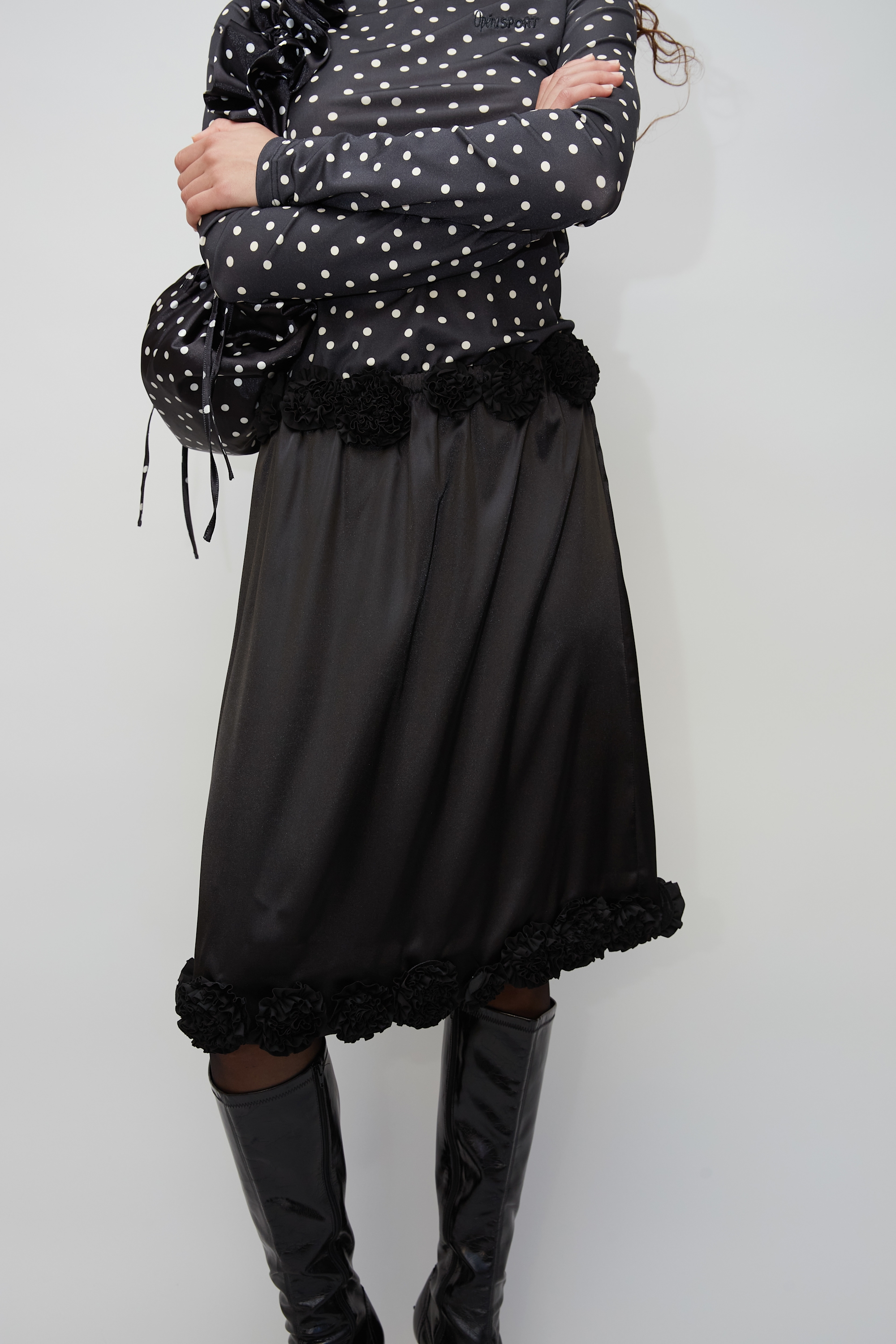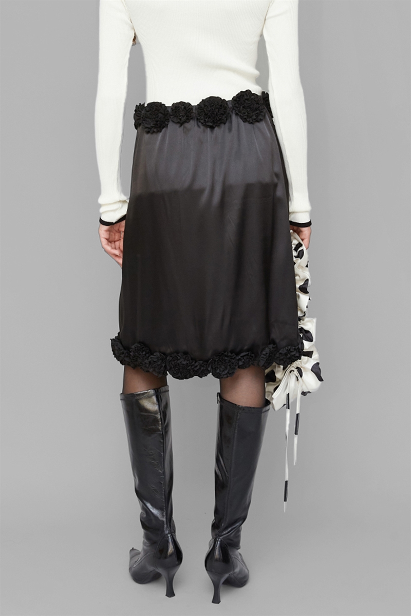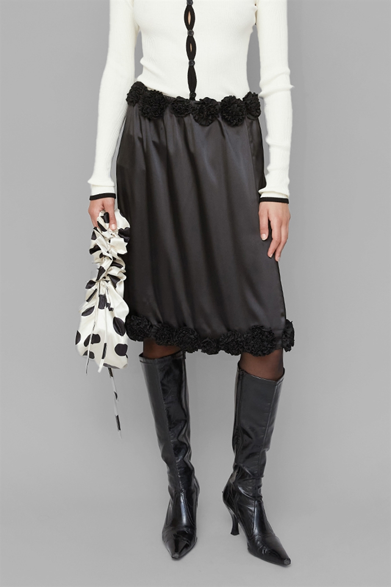 Hana Skirt er en elegant midi-nederdel fremstillet i 100% genanvendt polyester. Designet fremhæves af dekorative blomsterdetaljer ved både talje og søm, som giver et feminint og raffineret udtryk. Den enkle, lige silhuet skaber en tidløs form, der bevæger sig smukt og er let at style til både hverdag og særlige anledninger.