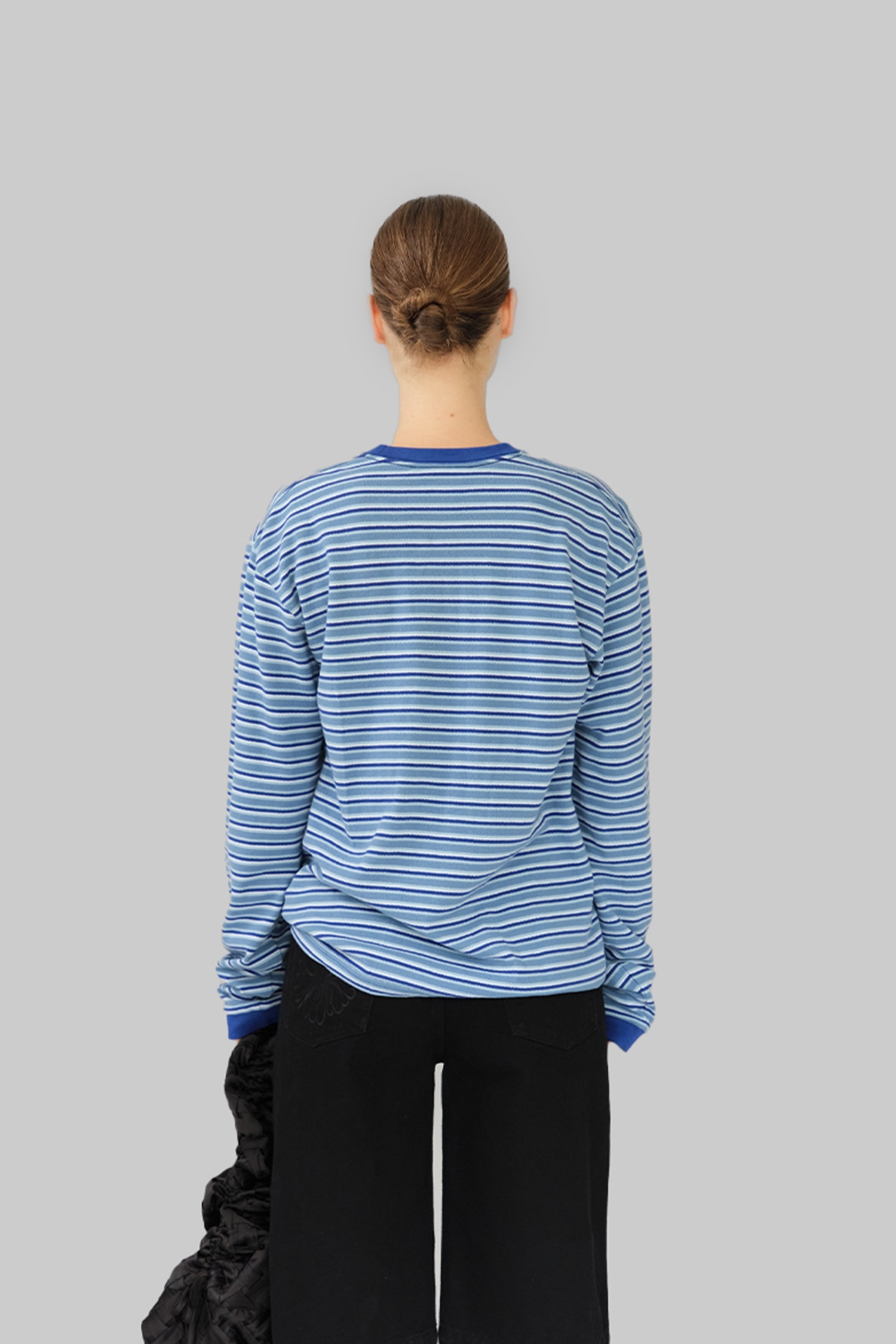 Neo Unisex T-Shirt fra Operasport er en afslappet og moderne t-shirt i blå striber, fremstillet i 100% økologisk bomuld. Den løse unisex pasform kombineres med lange ærmer, rund hals og ribdetaljer på krave og ærmekanter i kontrastblå. Den broderede OpéraSPORT-logo på brystlommen tilføjer et subtilt finish.