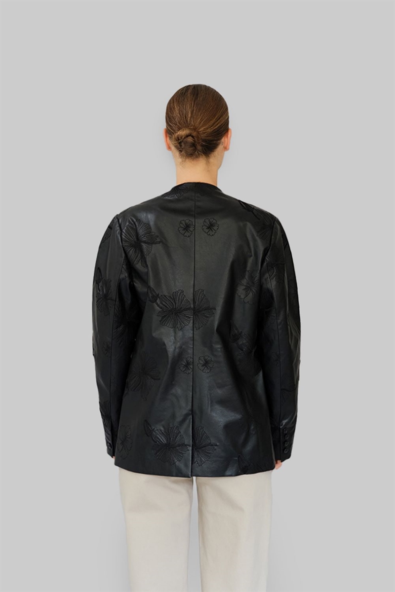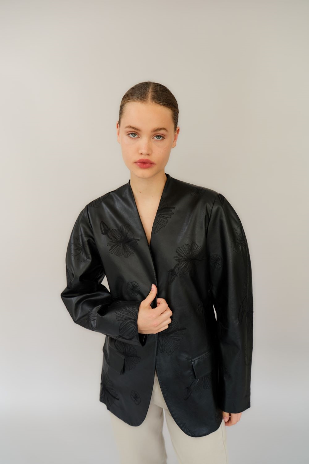 Rue Vegan Leather Jacket fra Operasport er en moderne og minimalistisk jakke i sort. Jakken har en boxy silhuet og er uden krave, hvilket giver en ren V-udskæring. Denne jakke kan bruges til hverdag, men også til en finere begivenhed.