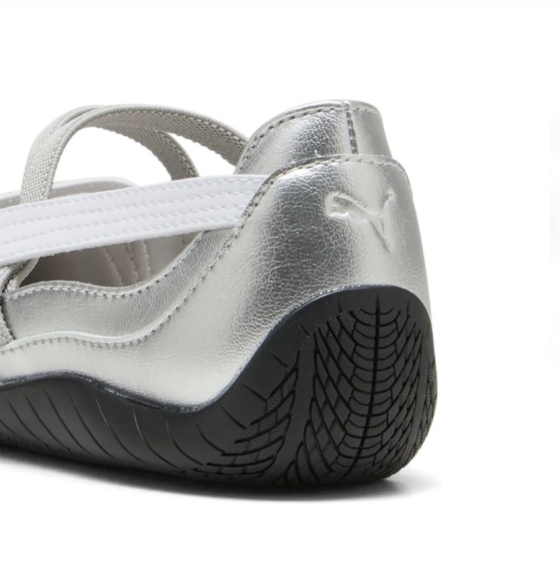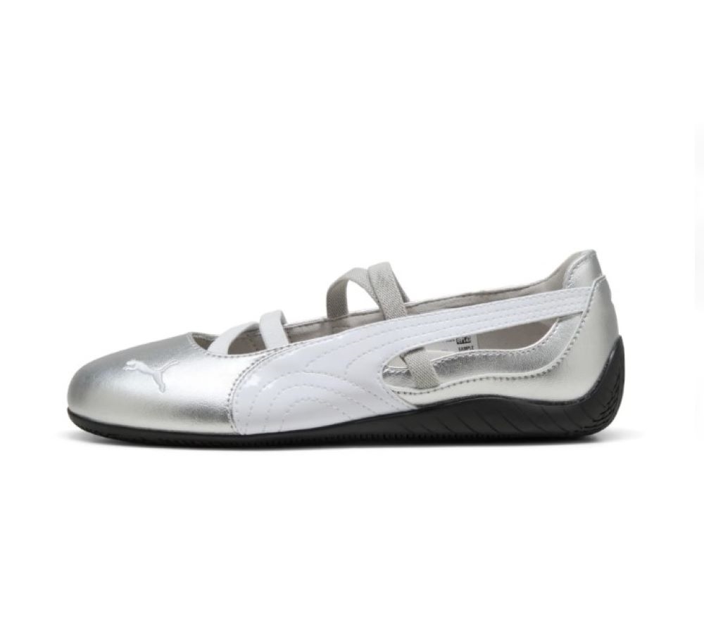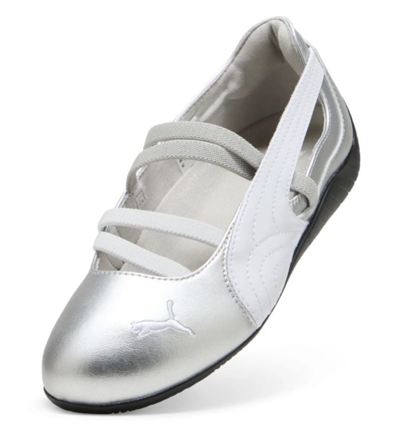 Speed cat ballerina fra Puma i farven silver, et ikon style fra Puma inspireret af motor sporten. inroduceret for første gang i starten af  2000erne. og er nu blevet en kæmpe trend, med dens design og smarte slanke form, rund snude og Puma logo.
