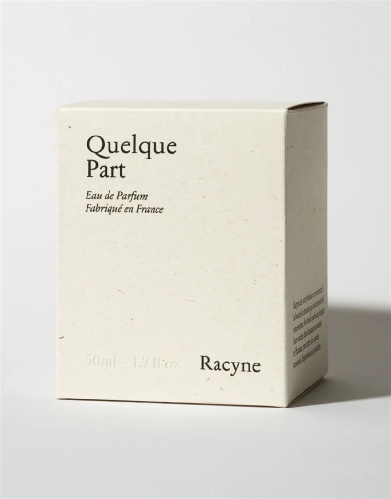 Quelque Part Perfume fra Racyne, er komponeret som et olfaktorisk tilflugtssted – en sanselig, cremet oplevelse fyldt med varme, harpiksagtige, muskede og let karamelliserede noter. Den omslutter kroppen med duften af varm sten, knuste fyrnåle og hud mod hud. En tryg og intim sammensætning, hvor ægte balsamgran, vetiver og jasmin smelter sammen med ambrettefrø, amber musk og et strejf af varm damp. Quelque Part efterlader et diskret men dyrebart præg – duften af blid selvsikkerhed og ro.