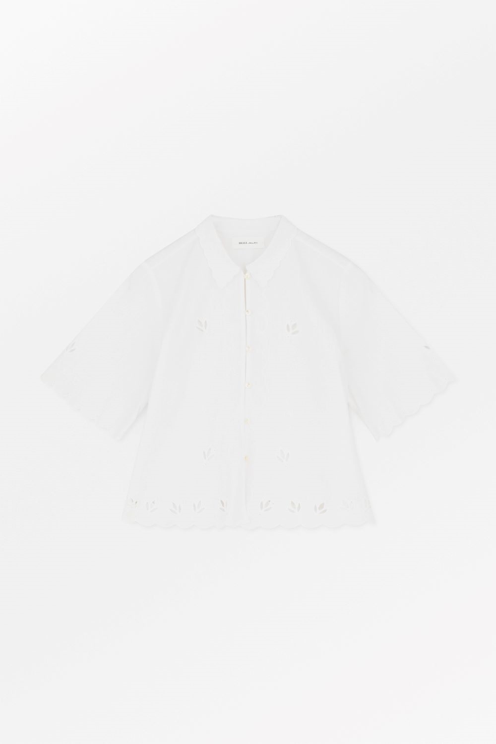 Kortærmet skjorte med klassisk krave, broderidetaljer og elegante udskæringer. Perfekt til et let og feminint look på varme dage eller til lag-på-lag styling.