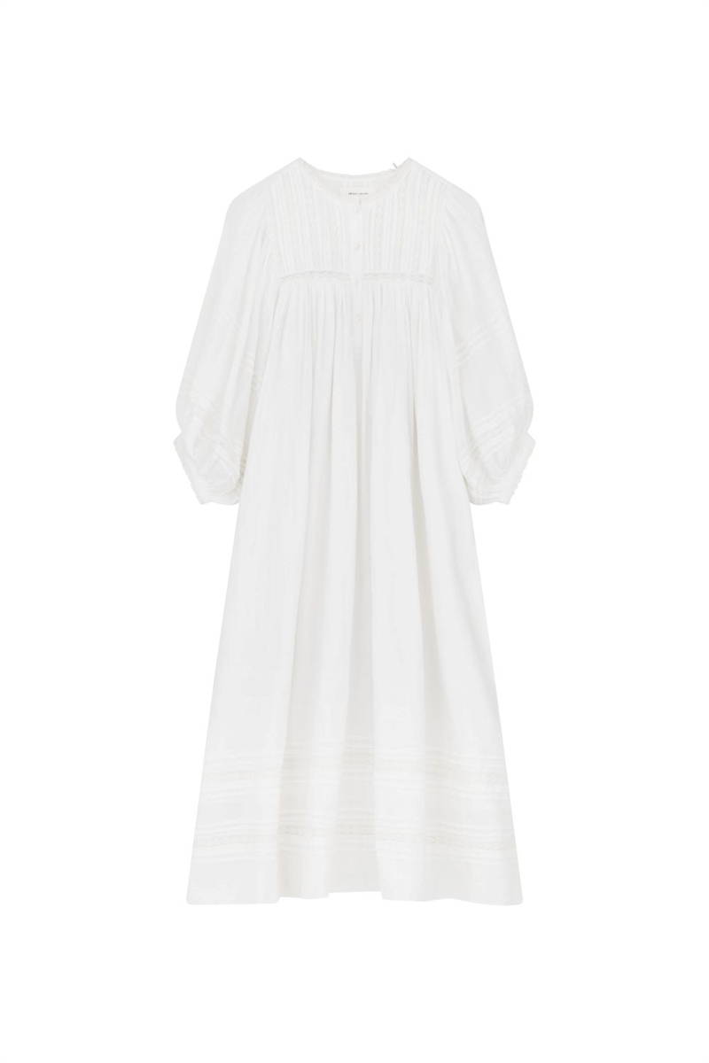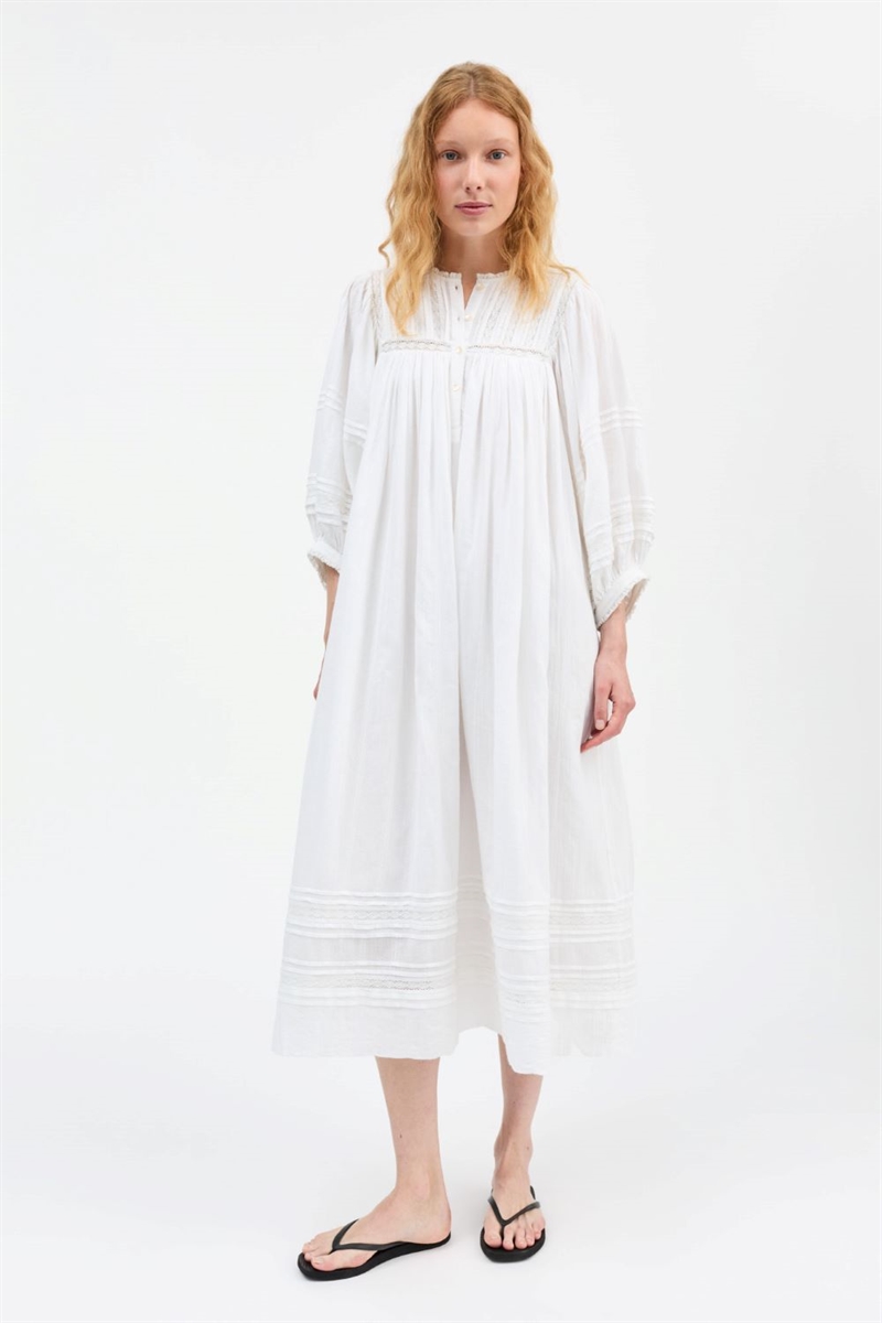 Lang kjole med bomuldsblonde, læg og smuk volumen. Designet med elegante detaljer, der giver et feminint og let udtryk. Perfekt til både hverdag og særlige lejligheder.