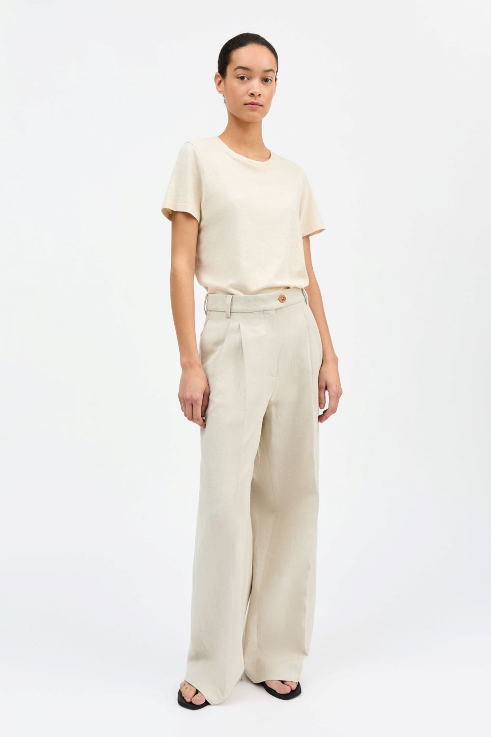 Blød t-shirt med rund hals og let løst fit i en komfortabel bomulds- og hørblanding. Perfekt som basisdel i garderoben eller til afslappede outfits.