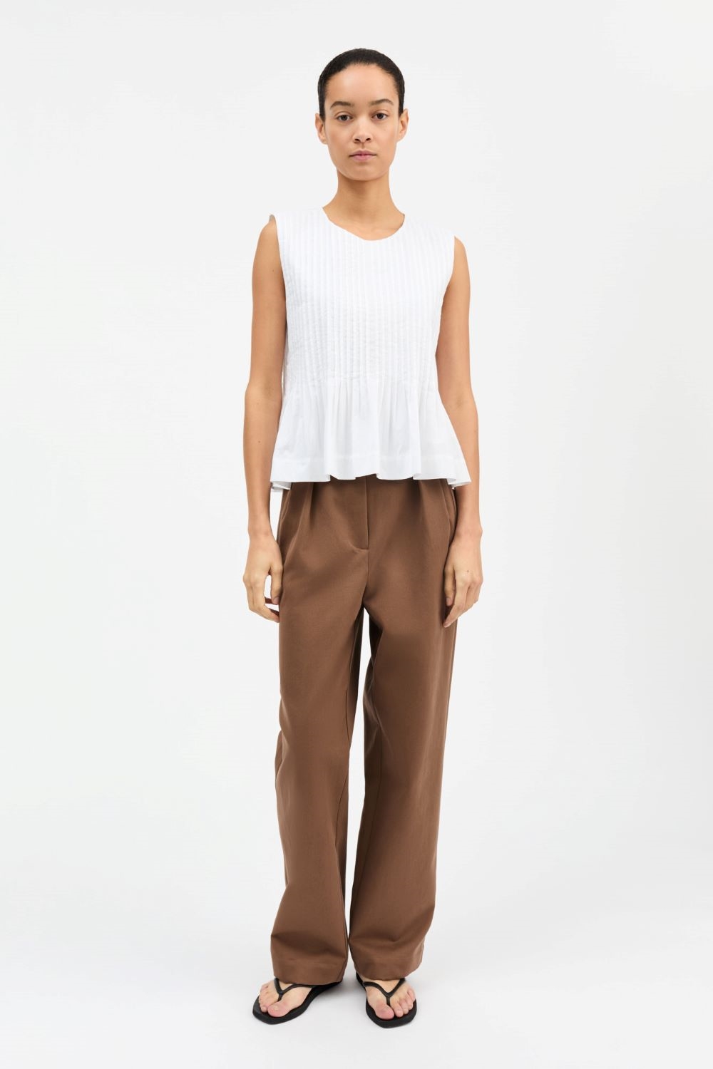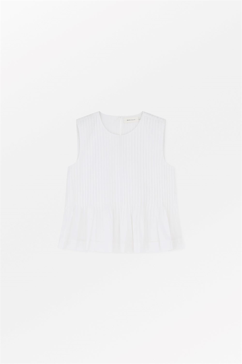 Ærmeløs top med rund hals og mange læg, der skaber volumen og et feminint, luftigt udtryk. Perfekt til både hverdag og festlige lejligheder.