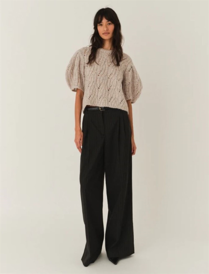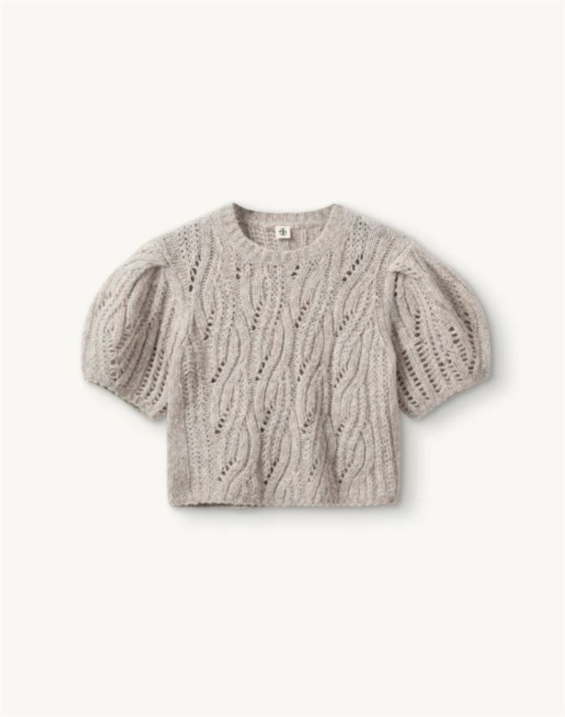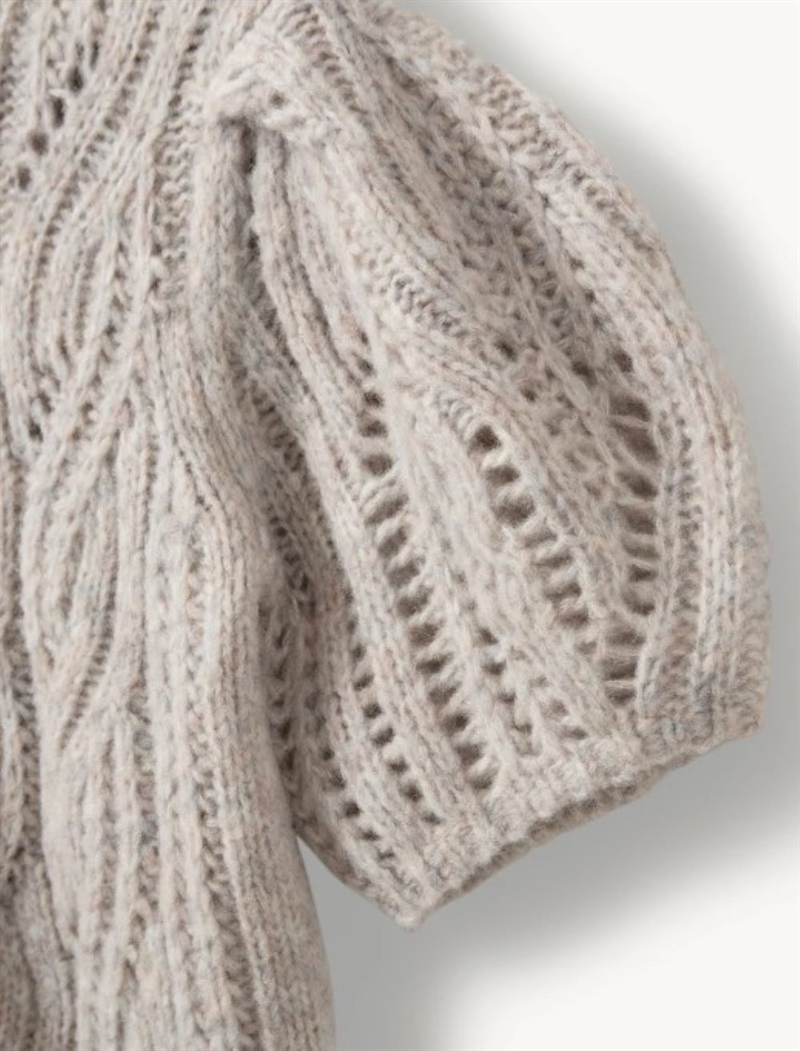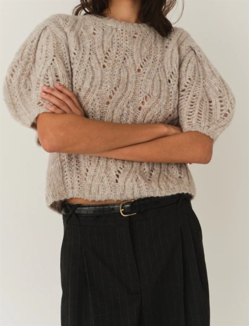 Valentina Sweater er en blød og feminin strikbluse, designet med voluminøse korte puff-ærmer, der giver et moderne og legende udtryk. Den melerede taupefarve og den fine strikstruktur gør den let at style både til hverdag og mere elegante lejligheder.